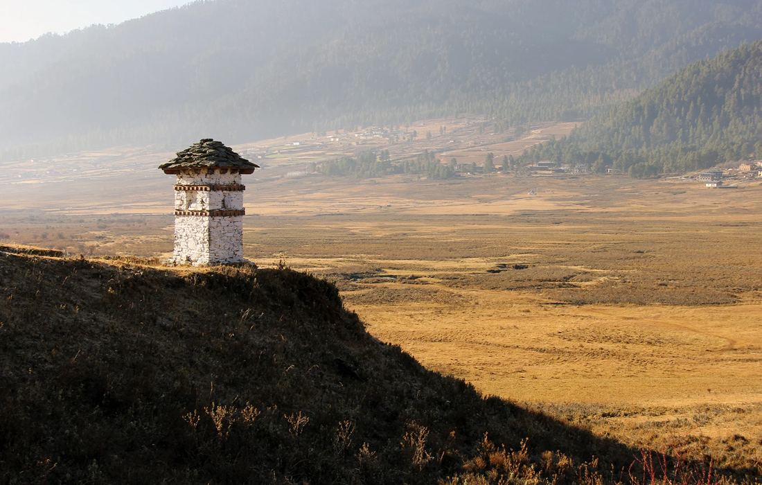Also known as Gangtey, the glacial valley is home to the endangered black-necked cranes whom the Bhutanese worship. Every year during winter these cranes make their long journey from Tibet to Bhutan to spend their winter in the valley. Locals consider the advent of the Black-necked Cranes as auspicious and believe that their migration to the Gangtey Valley portends a year filled with prosperity and happiness for the locals. The farmers in Gangtey look forward to the arrival of these endangered birds, as they believe that these birds bring with them good luck and good harvests for the coming year.