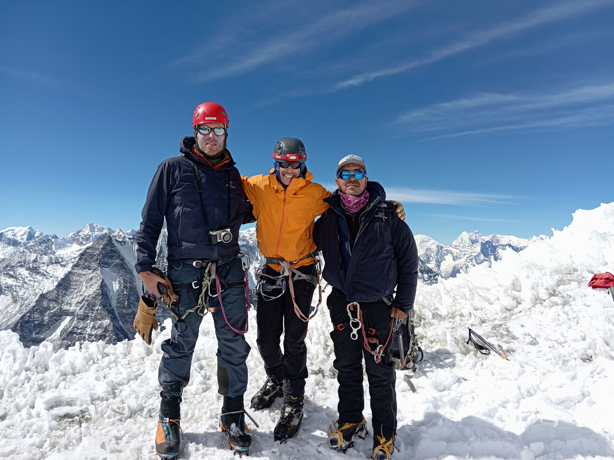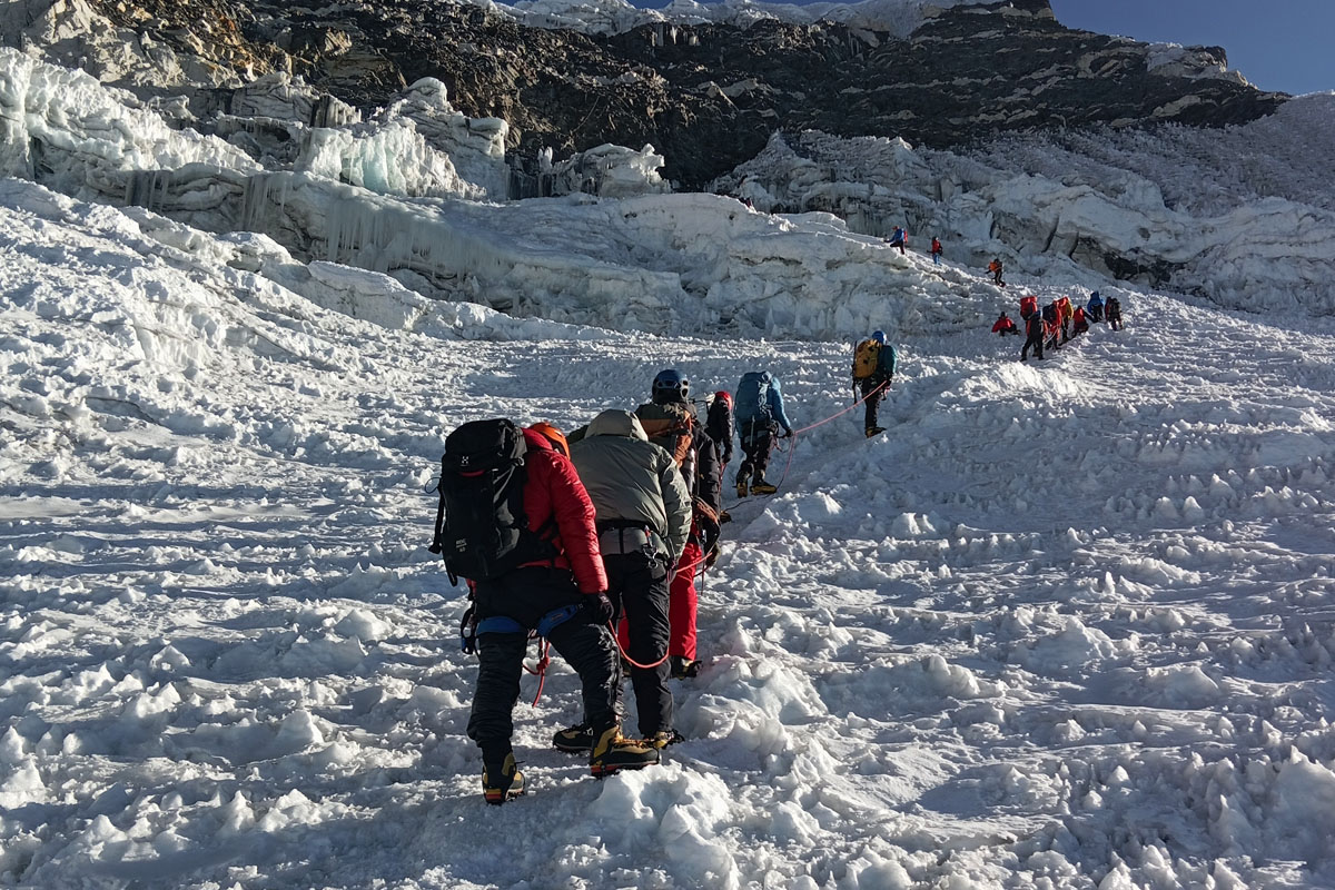 Once you reach an elevation of 5700 meters, the guide will chain up the team with ropes for safety. Make sure that you maintain the rhythm set by the group. You will walk past a ridge and the icy Imja Glacier. At intervals, you can stop with the group to catch your breath and savor the sunrise view over the snow-white mountains. There could be crevasses on the route, and ladders may be set up to get past these crevasses. Before reaching the summit, you will climb up a gradual incline of about 45 degrees. In front of you, you can see the grand summits of Makalu, Ama Dablam, Barun Tse, and Lhotse.