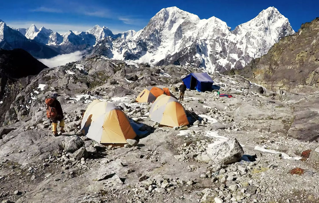 Lobuche East High Camp lies only a short trek from the teahouse. You can have a leisurely breakfast and hike to the high camp at a leisurely pace. On reaching the high camp, you will participate in pre-climb training where the Sherpa climbers will make you rappel up and down a hill using a rope. They will share tips on how to make knots and use your carabiner and jumars effectively. You will get helpful tips on how to use steel ladders to cross crevasses and what to do during emergencies in the mountains.