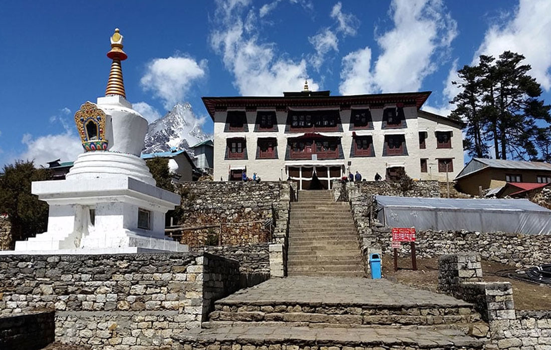 After a brief rest, you will continue your hike and take a steep path that weaves past a thick jungle. This part of the trail is filled with wildlife, so be cautious and alert. After climbing a steep stone staircase and walking past a grassy meadow, you will finally reach the monastic hamlet of Tengboche.