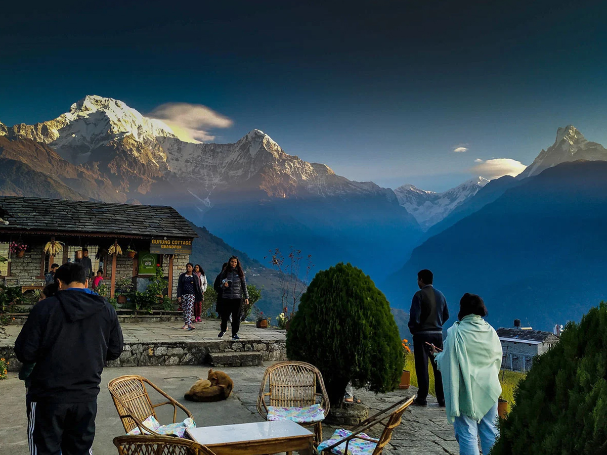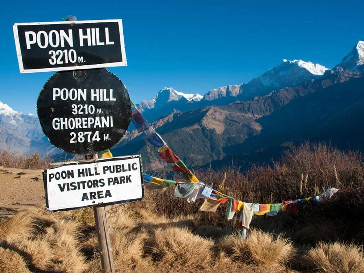 Wake up before sunrise and get ready to hike up to Poon Hill. Climb up a stone staircase, walk out of the village, and reach the base of the hill. The climb to the top of Poon Hill involves ascending a long staircase. It's a tiring climb that takes about an hour, but the panoramic views of the mountains from the top are worth the effort. As you walk up, you will be able to see the silhouette of the mountains looming in the dark.