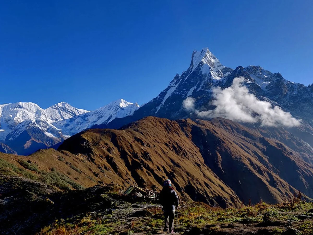 Your trip begins with your arrival in Kathmandu. From Kathmandu, you will catch a flight to Pokhara and then head towards Kande, the trailhead for your trek. From Kande, you will walk past Australian Camp and the village of Pothana to reach Pitam Deurali, the first day's halt. In the next couple of days, you will be walking past the hauntingly beautiful moss-covered forests of Forest Camp, Low Camp, and Badal Danda. With High Camp as your base, you will hike to Mardi Himal Base Camp. The hike involves a spectacular walk on an exposed ridgeline. The forked summit of Machapuchhre, or Fishtail Peak, and Mardi Himal rear close to the ridge.