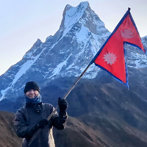 Enjoy a hot beverage and gaze at the beautiful forked summit of Macchhapucchre or Fishtail Peak. You will be walking close to this peak in the next few days.